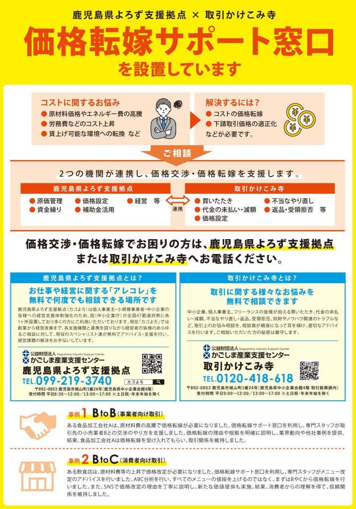 中小企業庁は、適切に価格交渉・価格転嫁できる環境を整備するために、全国47都道府県に設置しているよろず支援拠点に「価格転嫁サポート窓口」を新設し、下請中小企業の価格交渉・価格転嫁を後押しします。