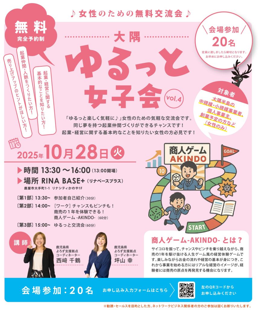 対象者 大隅半島の中規模・小規模事業者、個人事業主、創業予定の方など(女性のみ)