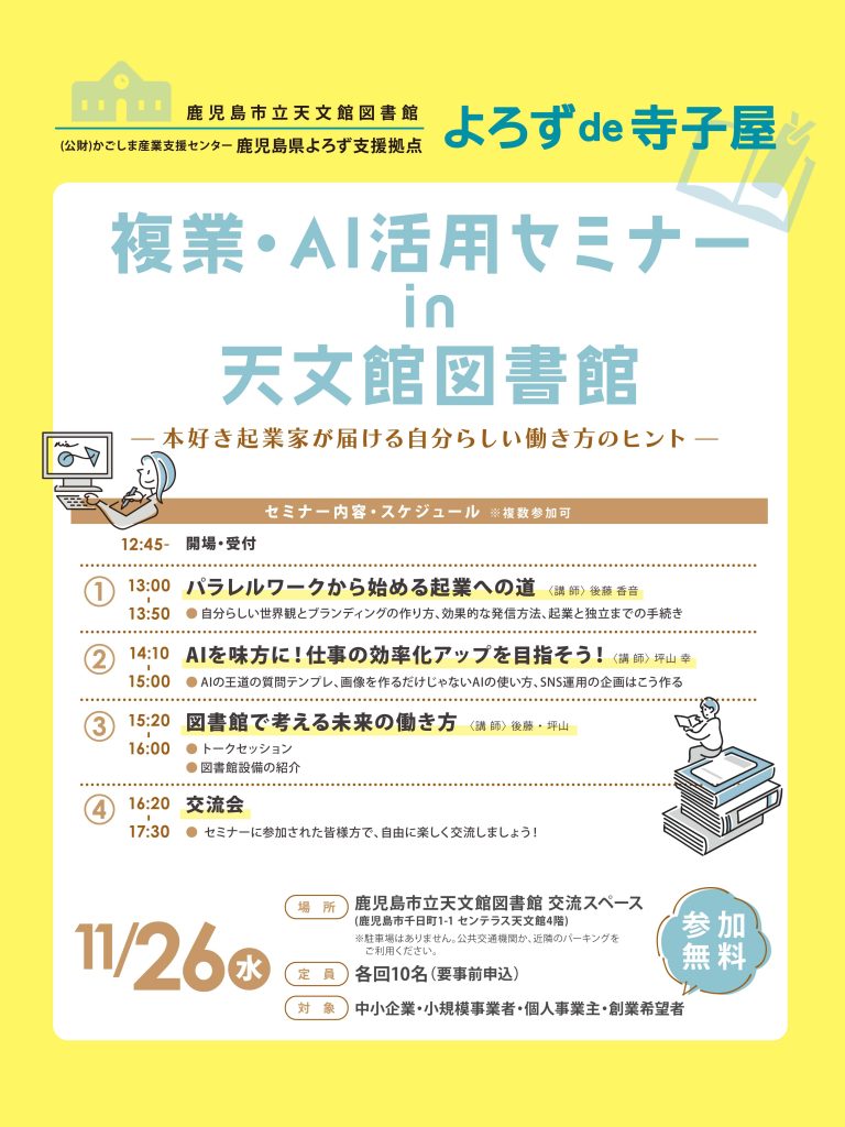 よろずde寺子屋「複業・AI活用セミナ in 天文館図書館」(参加無料・要予約)